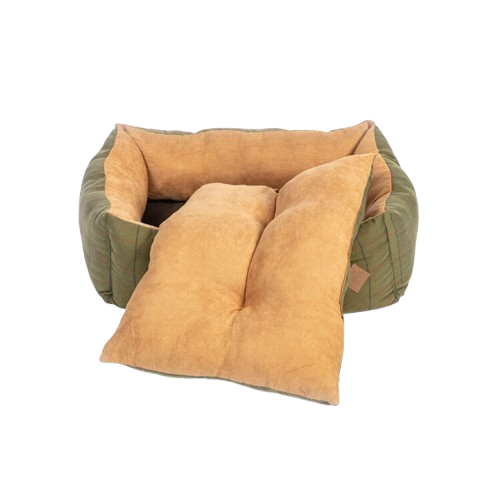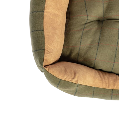 The optimum country style, this colour woven green tweed fabric is brushed for extra softness and matched with a smooth faux suede in subtle tan colour.