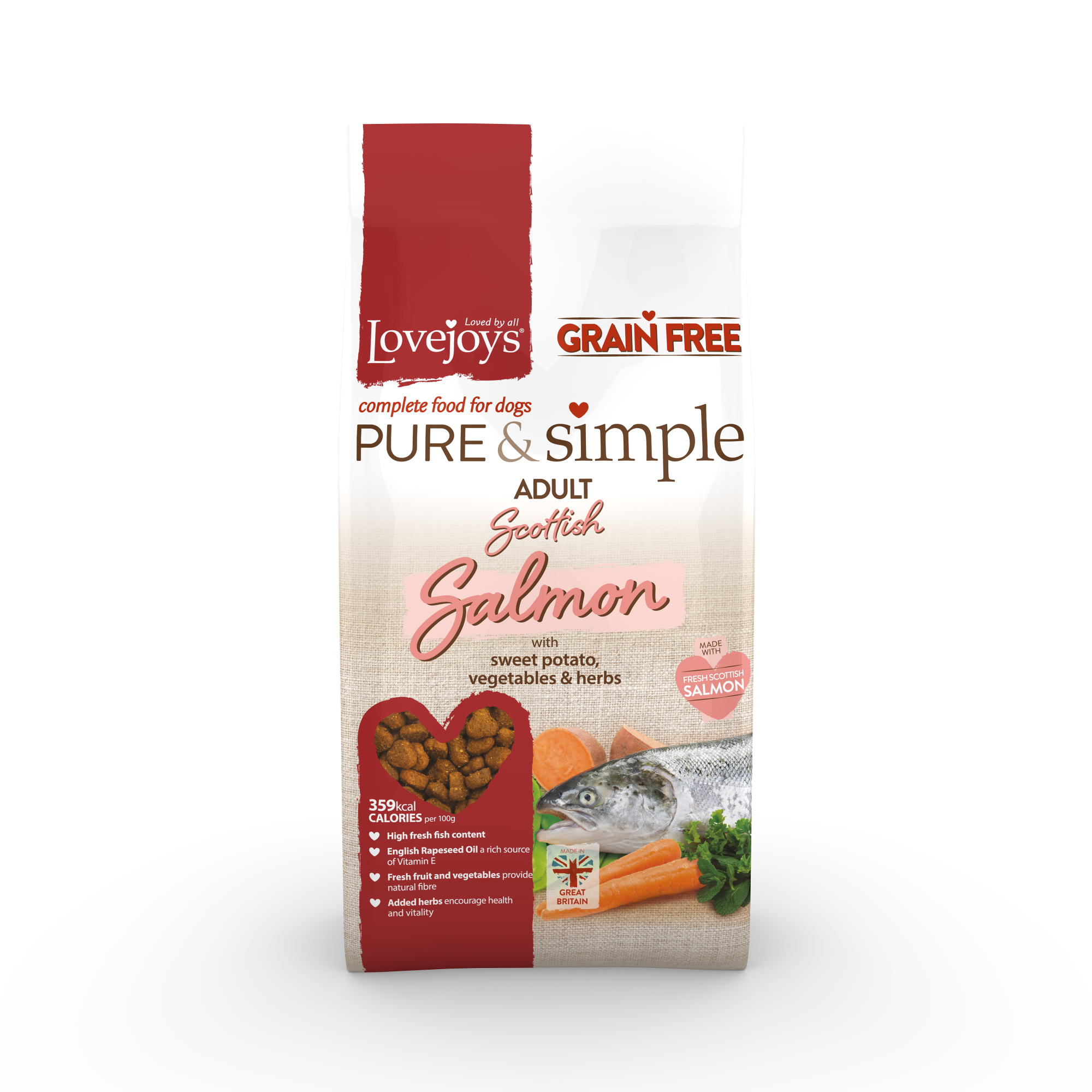 Lovejoys Pure & Simple dry food is complete and suitable for all dogs aged 8 weeks and over. Feeding amounts are a guide only, as needs can vary based on breed, age, and activity level. Feed to maintain a healthy, lean body condition, introduce new food gradually, and always ensure fresh, clean water is available.