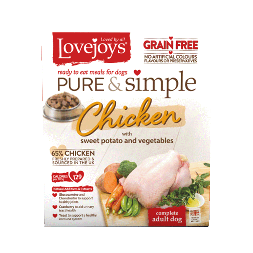 Containing a minimum 65% freshly prepared meat Lovejoys® Pure & Simple ready to eat meals for adult dogs are all grain free. Our Chicken with Sweet Potato and Vegetables is made using the best quality, freshly prepared chicken, sourced in the UK. We combine the chicken with a blend of sweet potato, vegetables, herbs and sunflower oil to make a ready to eat meal that dogs love.
