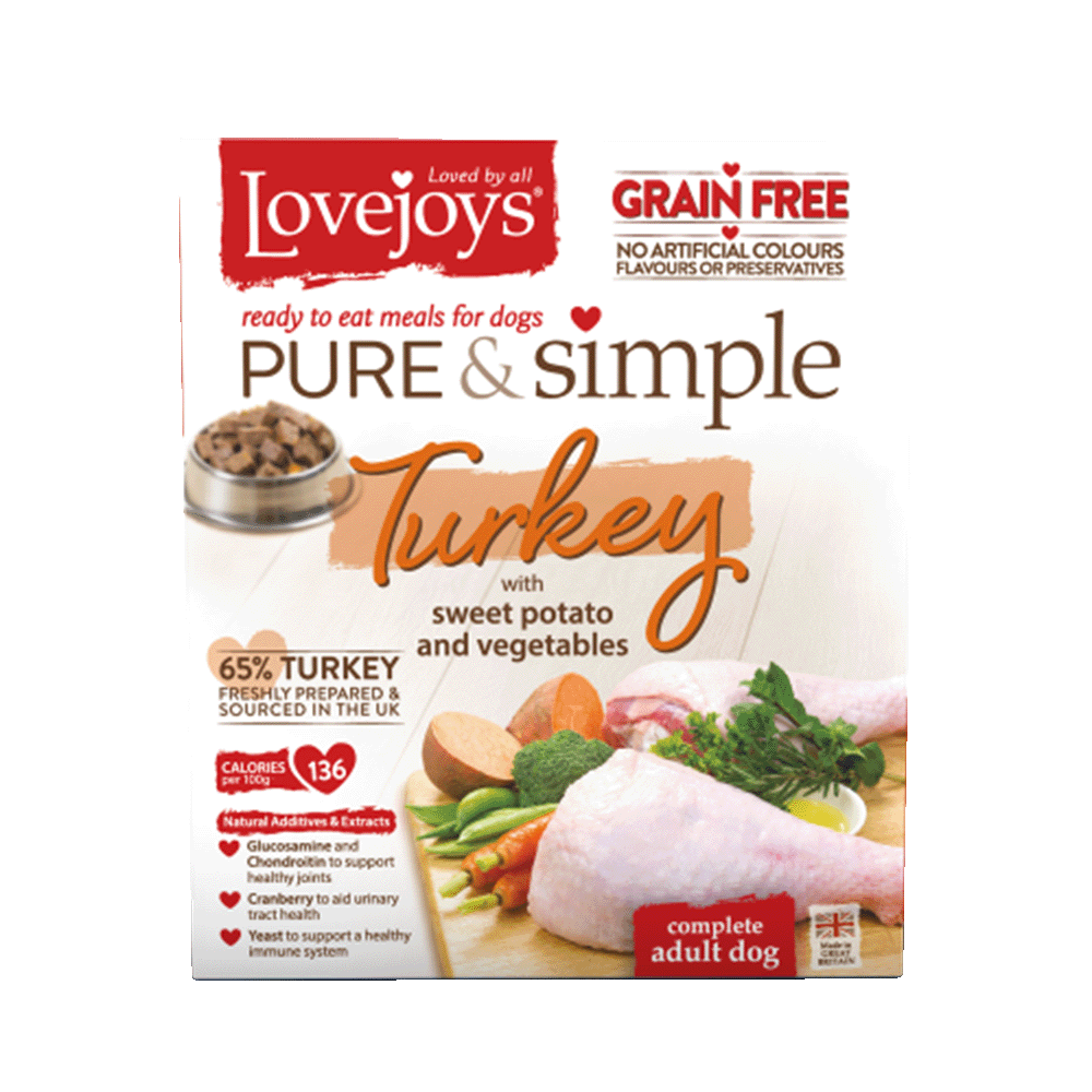 vejoys® Pure & Simple ready to eat meals for adult dogs are grain free and contain a minimum 65% freshly prepared meat. We use only fresh turkey prepared and sourced in the UK for our Turkey with Sweet Potato and Vegetables. This is combined with sweet potato, vegetables, herbs and sunflower oil to make a ready to eat meal that dogs love.