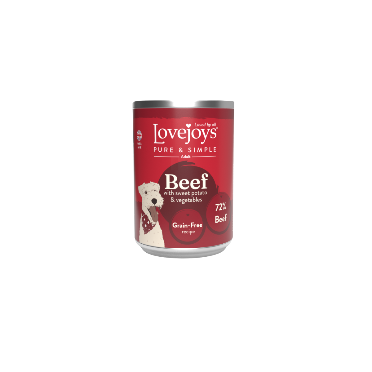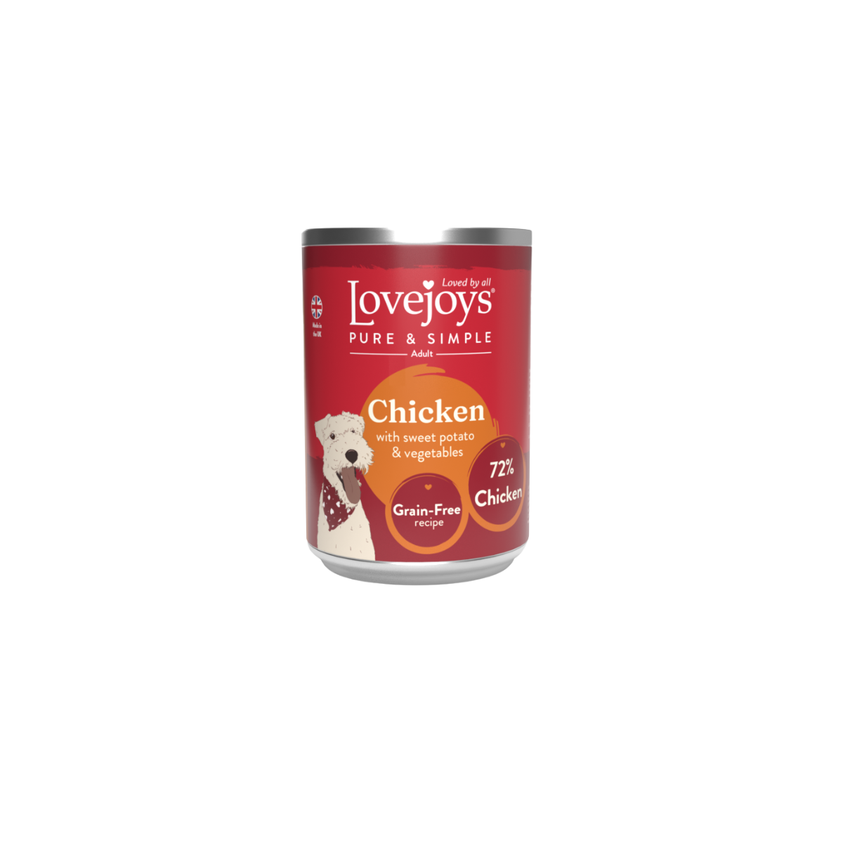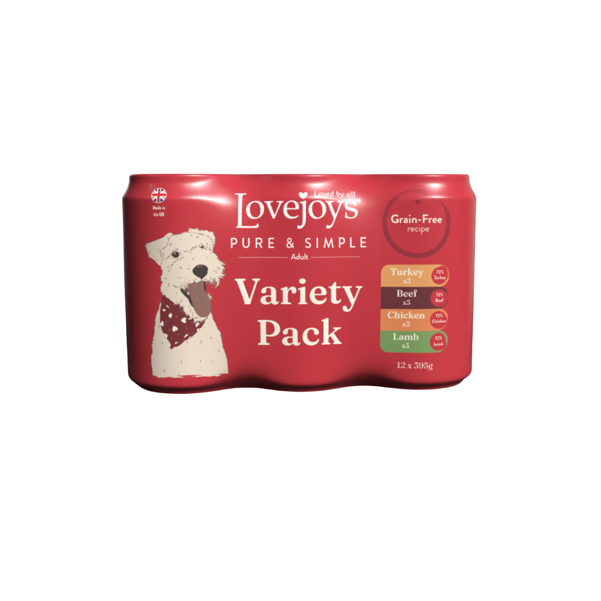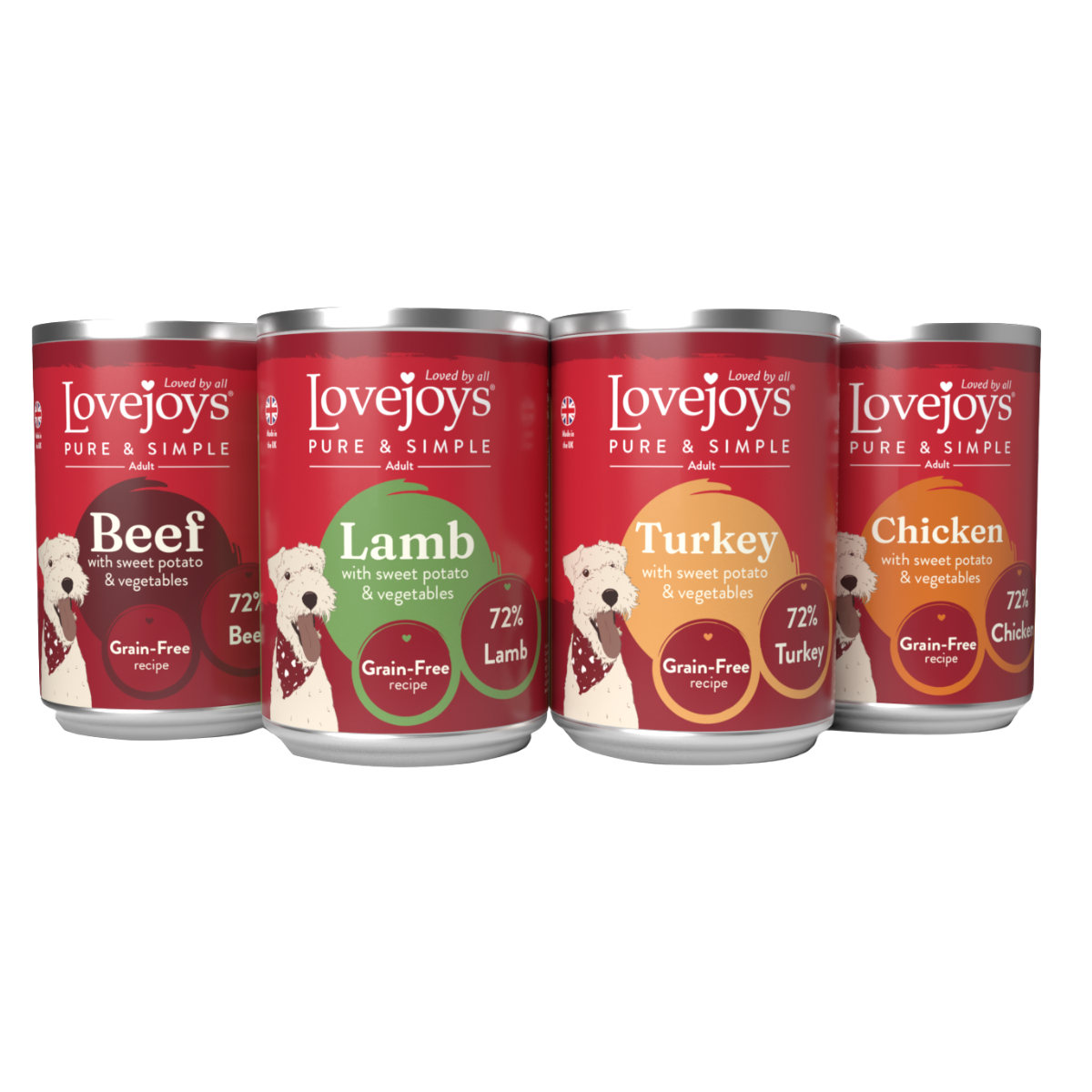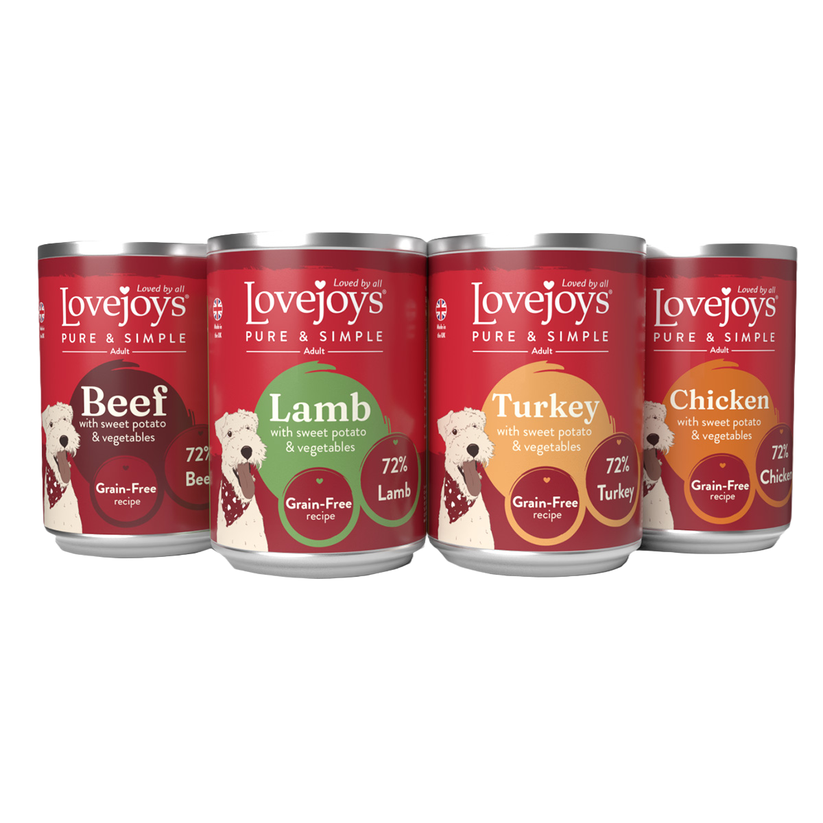 Lovejoys® Pure & Simple tinned meals for adult dogs are made with natural ingredients to provide a complete and balanced diet. This tasty variety pack includes four delicious recipes: Chicken, Beef, Lamb and Turkey, each prepared with 72% meat and vegetables for a wholesome and nutritious meal.